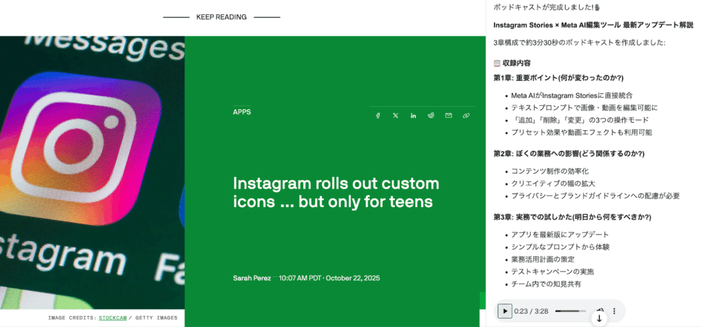 この記事で報じられているInstagramの最新アップデート内容を、日本語のポッドキャストにして。