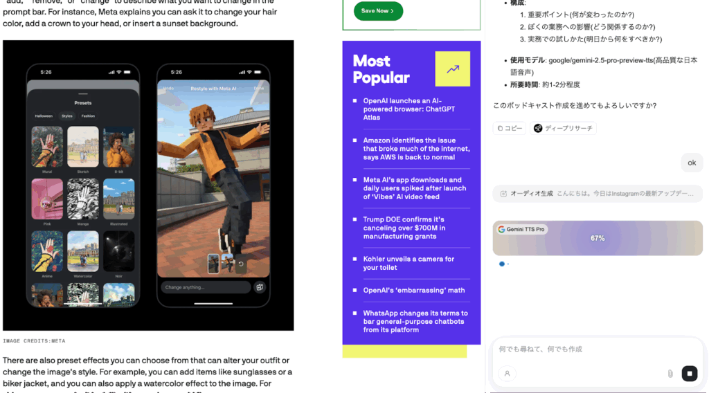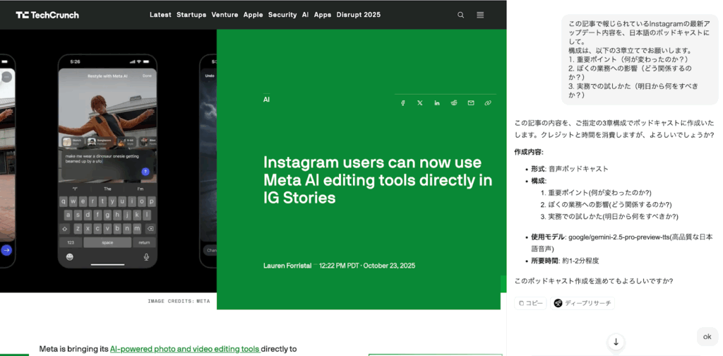 数分後にはAIブラウザでポッドキャストが完成します↓