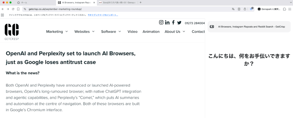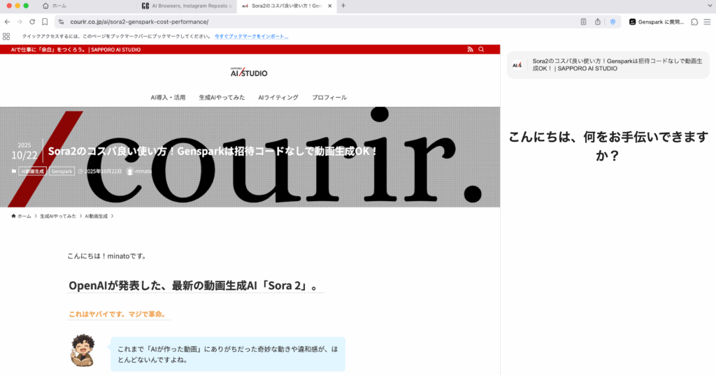 ジェンスパークのブラウザでこのブログ「SAPPORO AI STUDIO」を開いた画面がこちら。